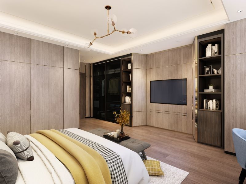 | الوظيفة | تتضمن خزانة ملابس كاملة الارتفاع مع أبواب زجاجية/من حبيبات الخشب، ورفوف مفتوحة، ومنطقة تلفزيون بألواح خشبية |