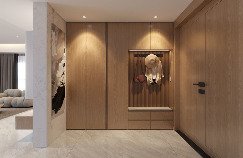 | لوحة الحائط | لوحة جدارية من الشبكة الخشبية خلف المنطقة المعلقة، مما يضيف عنصر تصميم متطور وملموس. |