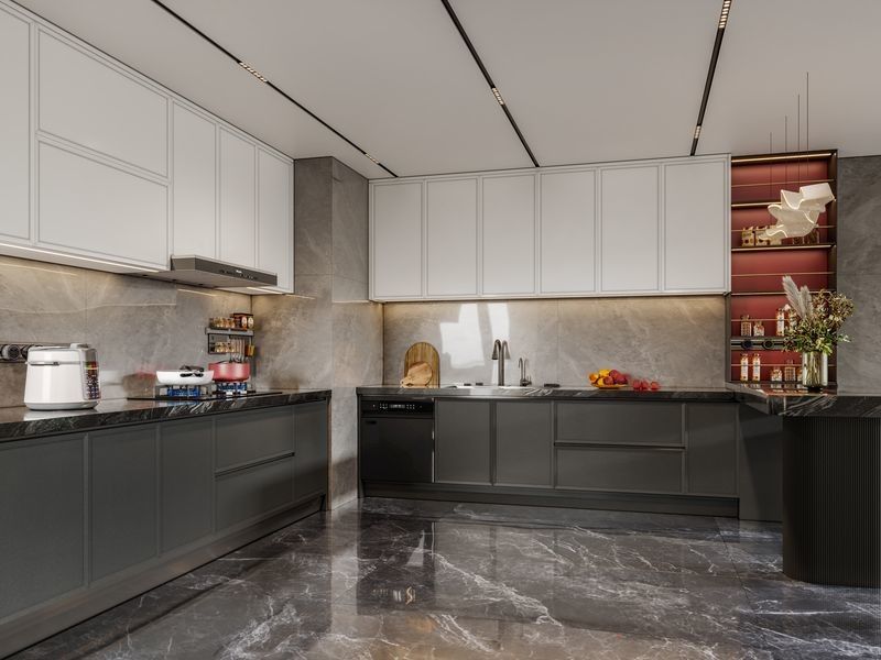 يتم تقديم خزانة المطبخ هذه كنظام موجه بالتصميم بدلاً من مجرد منتج قياسي. تستخدم اللون الأبيض / الأسود مع هيكل خزانة من الفولاذ المقاوم للصدأ الفاخر لخلق هوية بصرية أكثر اكتمالاً لمشاريع السكن الفاخرة.