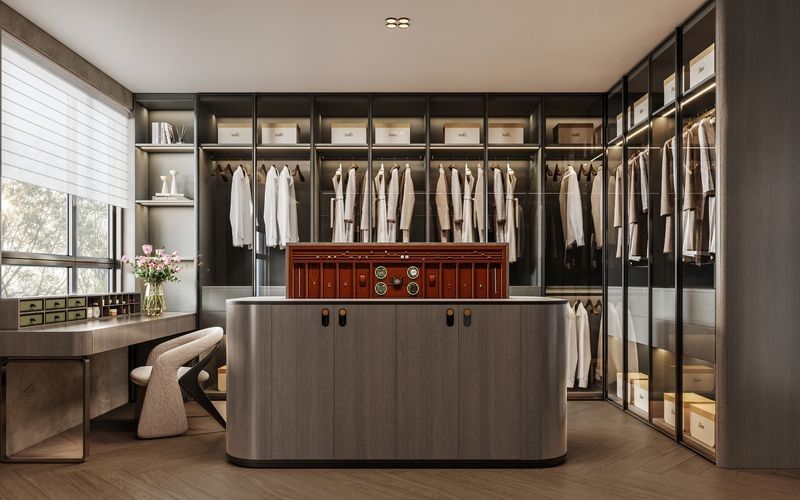 كما أنها تجمع بين تصميم على شكل حرف L مع قضبان تعليق مدمجة وأدراج ورفوف لتنظيم فعال. ، مما يساعد المشترين على الحكم على ما إذا كانت قصة التشطيب وتكامل الأجهزة والتخطيط للاستخدام اليومي يمكن أن تظل متوافقة في نظام واحد.