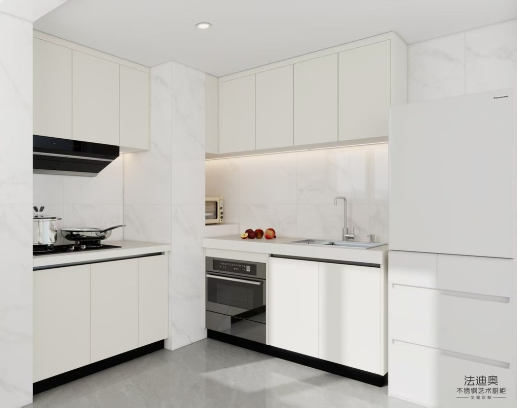 compact white stainless steel kitchen,modern kitchen cabinet with storage,streamlined workflow kitchen cabinet