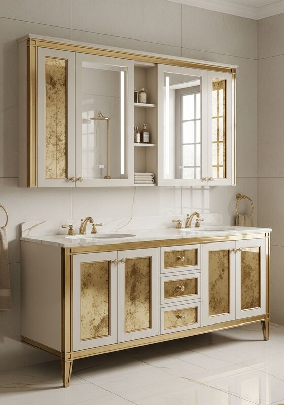 | Q: Is 304 food-grade stainless steel with PVD champagne gold coating; cream high-gloss automotive lacquer; gold-tinted antique mirror glass; honey onyx accent panel necessary for this bathroom vanity cabinet? For premium projects, 304 food-grade stainless steel with PVD champagne gold coating; cream high-gloss automotive lacquer; gold-tinted antique mirror glass; honey onyx accent panel is chosen because it holds up better against moisture, cleaning routines, and long-term dimensional movement than wood-based construction. That is especially relevant in master bathroom vanity for luxury residential, hospitality suites, and wellness-focused spaces seeking warmth-rich materiality where buyers want a cleaner maintenance story without giving up a tailored finish direction. |
