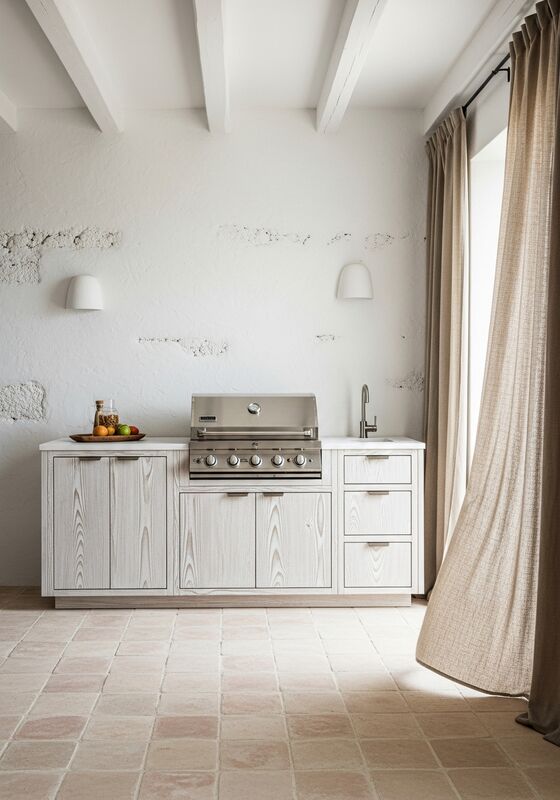 | أسلوب التصميم | ساحلي بسيط — مبيض بالشمس، غير لامع، سائد باللون الأبيض الدافئ مع نسيج حبيبات رمادي خفيف |