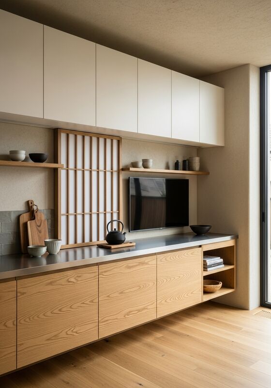 بساطة يابانية مقيدة مع دفء مادة وابي سابي - هيمنة خشب البلوط المستقيم، واللون الأبيض المصفر الدافئ ا |